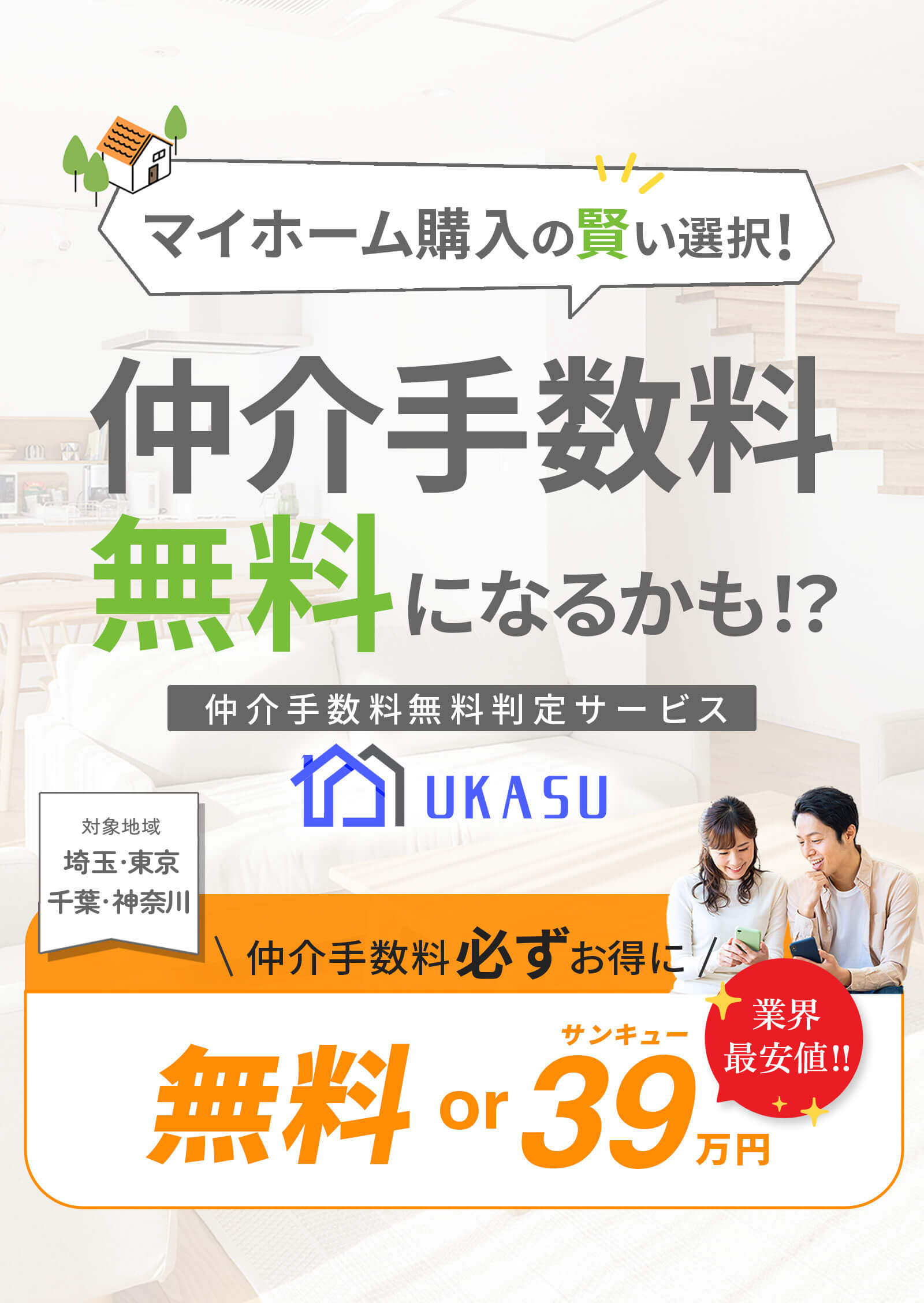 売主から手数料をもらえる可能性があるからです。UKASUでは、ご希望の物件が手数料を無料にできるかどうかを簡単に判定できます。