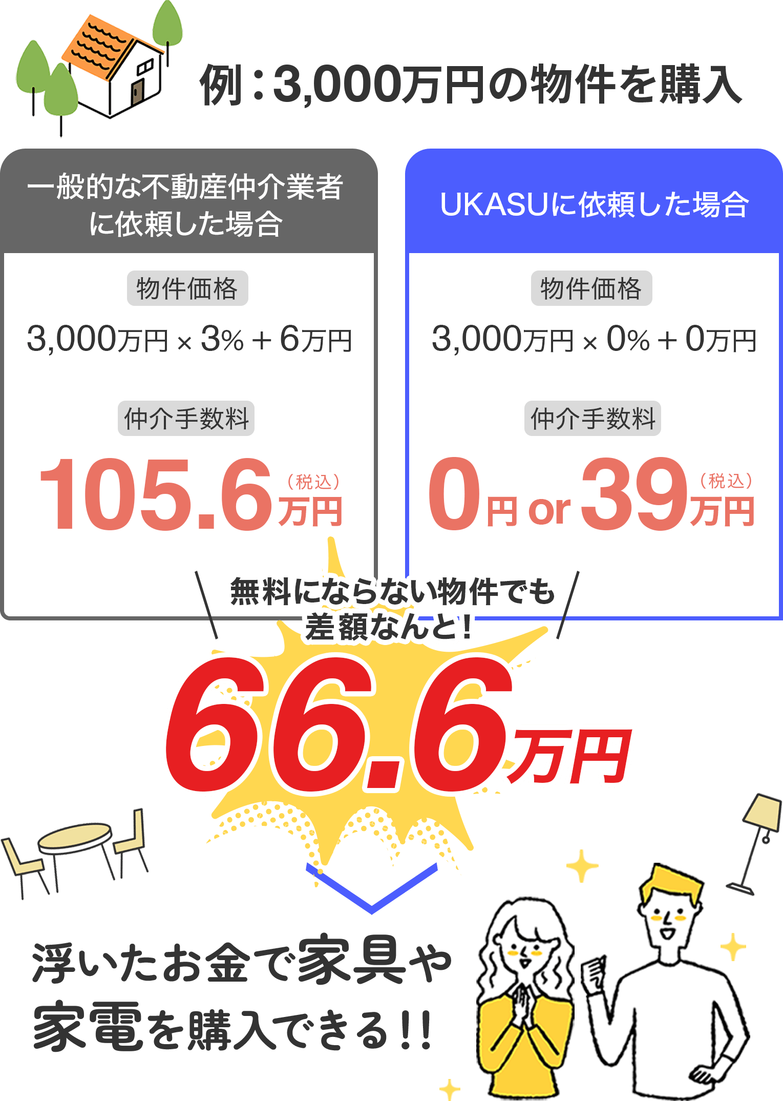 無料にならない場合でも、当社なら業界最安値のお得な手数料でご案内が可能です。営業マンや余計な諸経費を廃止することでこのような低価格を実現しております。